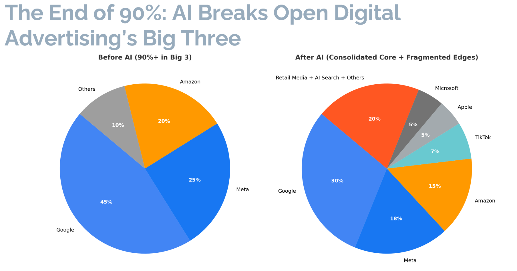 - Shift in competition. Google, Meta, and Amazon will still anchor the core of digital advertising, but the real story is the fragmented edges - new, high-intent environments like ChatGPT, TikTok, Apple, Microsoft, and retail media. Winning in this new era will require mastering the Consolidated Core while experimenting at the Fragmented Edges.